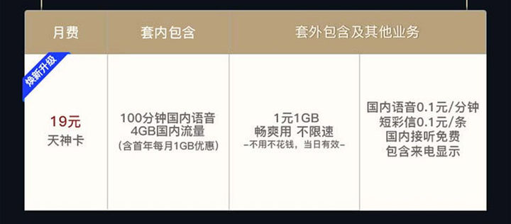 套餐详情:天神卡入网当月起连续12个月套餐内每月含1GB优惠,可添加5个亲情号。